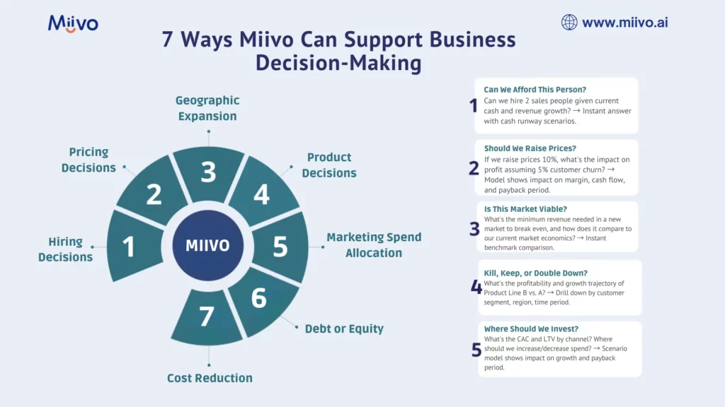 AI way: “Can we hire 2 sales people given current cash and revenue growth?” → Instant answer with cash runway scenarios.